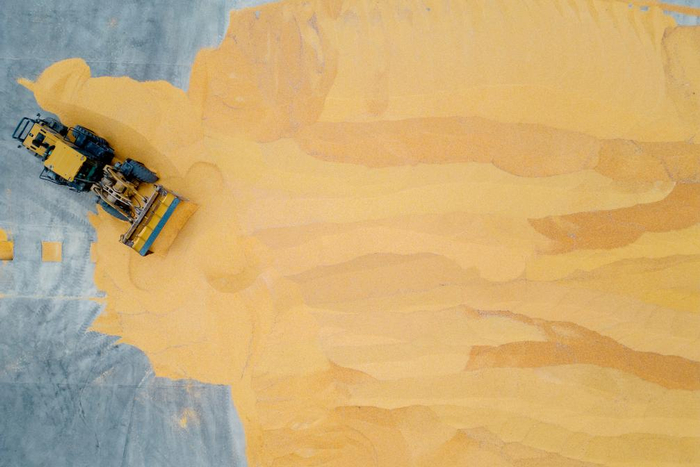 11月5日,在黑龙江省富锦市万里利达粮食储备有限公司内,工作人员在进行玉米分堆作业(无人机照片)。新华社记者 张涛 摄