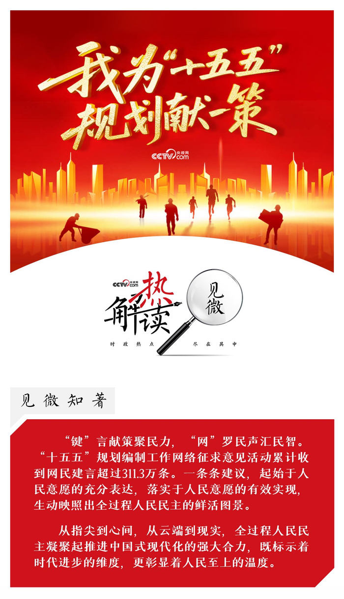 从“云帆”的故事到“十五五”规划的超311.3万条网民建言,全过程人民民主在实践中不断丰富发展,也让“人民当家作主”的制度优势更加可感可知。