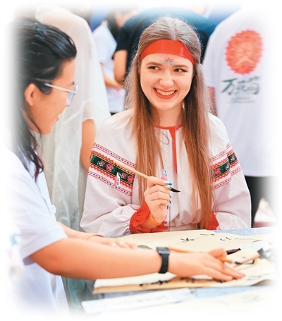 8月6日,“上合之约·丝路津彩”上合国家青年学生“万花筒”文化市集在天津举行。图为青年学生体验书法。